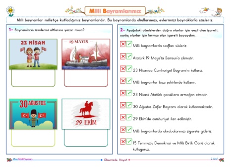 Bayramların isimlerini altlarına yazar mısın? Aşağıdaki cümlelerden doğru olanlar için yeşil olan işareti,
